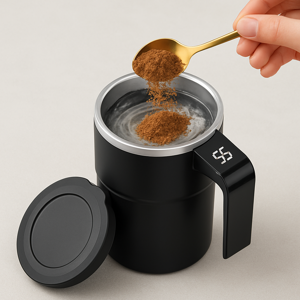 Slowly add coffe powder or protein powder (also for te)